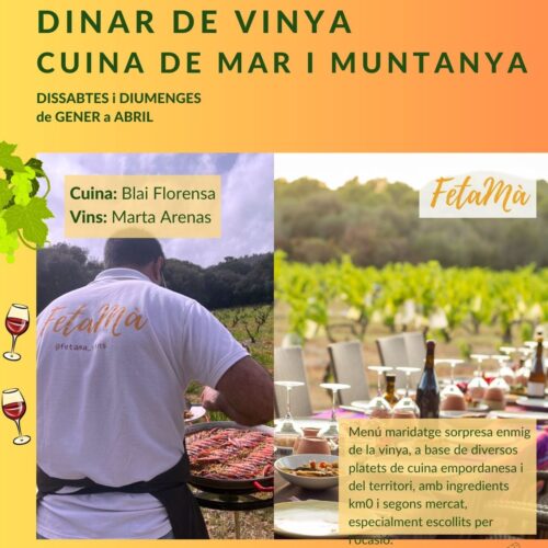 Juntament amb Blai Florensa, reconegut xef del territori Baix empordanès organitzem esmorzars i dinars de vinya per a colles entre febrer i abril. Durant l’estiu us oferim un ampli calendari d’activitats i sopars de vinya amb la col·laboració d’altres reconegut/des xefs, ideals per gaudir de capvepres o maravelloses nits enmig la vinya.