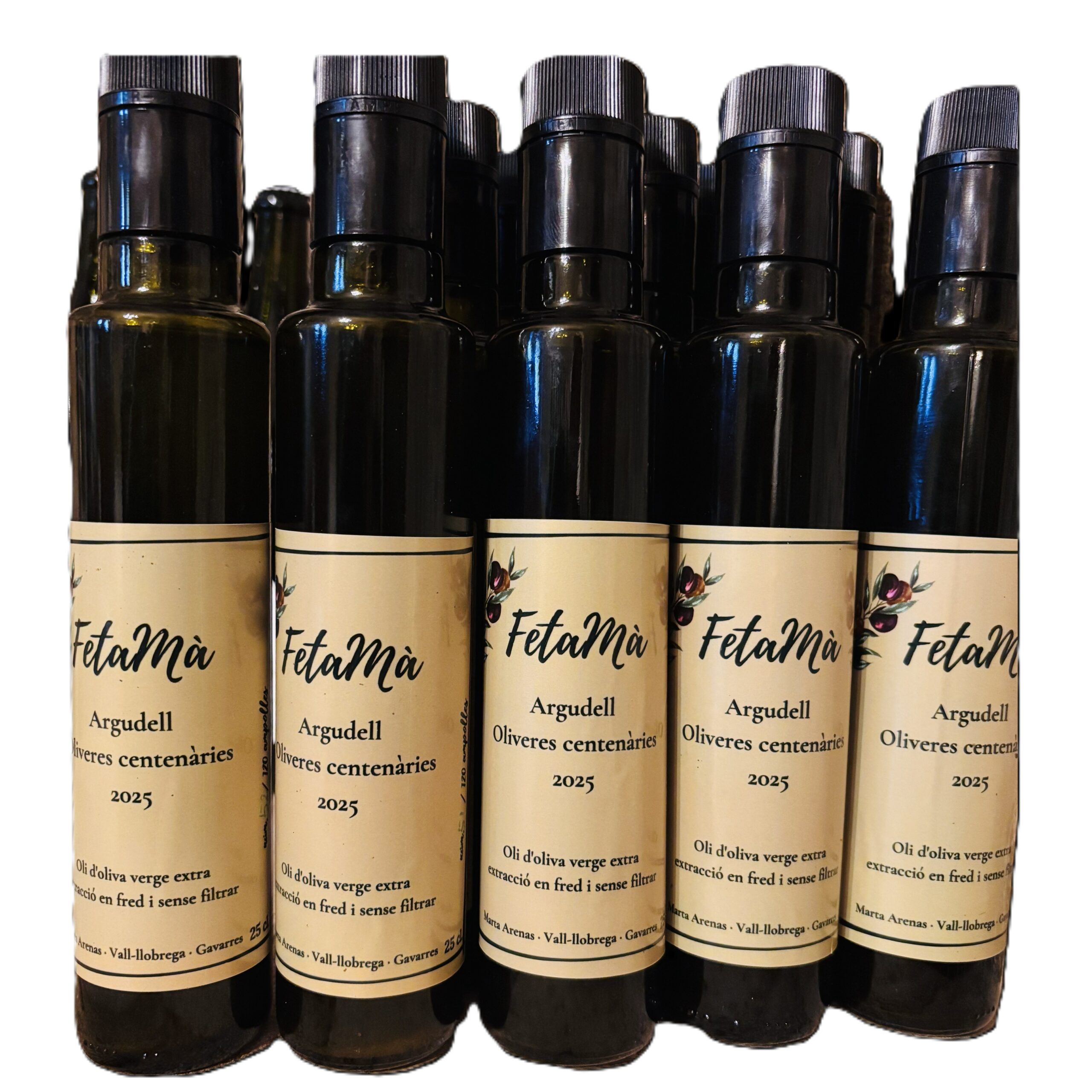 Oli d’oliva verge extra, d’oliveres centenàries i mil·lenàries de la varietat antiga d’Argudell, ubicades a Vall-llobrega, al Baix Empordà. Recollides i moltes el 25 d’octubre de 2025.